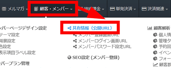 メンバー登録ページのURLや、ウェブサイトにメンバー登録用のボタンを表示するための埋め込みコードなどの設定画面は、ダッシュボード上部の「顧客・メンバー」→「共有情報(公開URL)」をクリックすると見ることができます。メンバー登録フォームを作成すれば、オンラインで顧客のメンバー登録を受け付けることが可能。