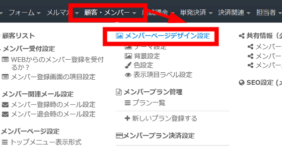 登録済みのメンバーには、ログインすることでアクセス可能なメンバーページを提供することができます。メンバーページのデザインを変更するには、ダッシュボード上部の「顧客・メンバー」から「メンバーページデザイン設定」をクリック。