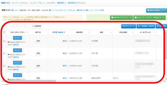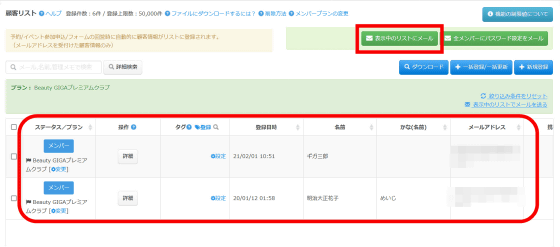 すると、チェックを入れたメンバープランの顧客だけが表示されました。メンバープランの顧客を確認したり、「表示中のリストにメール」をクリックして特定のメンバープランに入っている顧客限定でセールやキャンペーンの告知メールを送信したりすることが可能です。