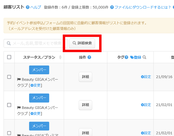メンバープランごとの顧客リストを抽出するには、顧客一覧の上部にある「詳細検索」をクリック。