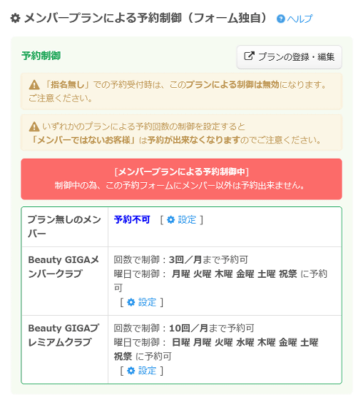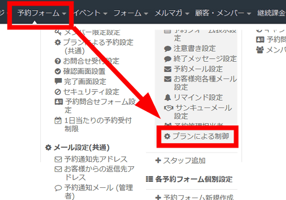 また、メンバープランごとに予約できる時間帯や上限回数などを制御することもできます。メンバープランごとに予約設定を変更するには、ダッシュボード上部の「予約フォーム」→「プランによる制御」をクリック。