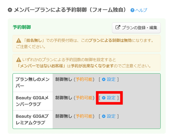 すると設定画面が開くので、調整したいメンバープラン右側の「設定」をクリック。