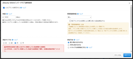サブスクリプションの料金や課金サイクルなどを設定し、「保存する」をクリックすれば販売が可能。