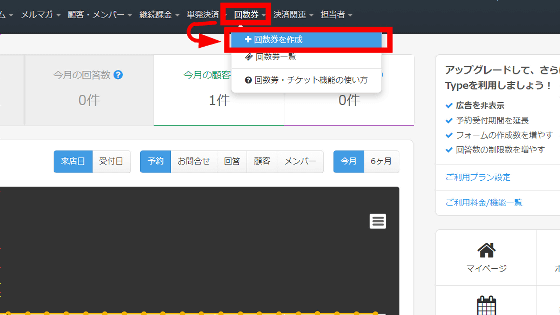 また、メンバープランと予約システムを組み合わせることで、「回数券(チケット)」を販売し、顧客が回数券を使って決済できるようにすることも可能です。回数券を導入するには、まずダッシュボード上部の「回数券」メニューを開き、「回数券を作成」をクリックします。