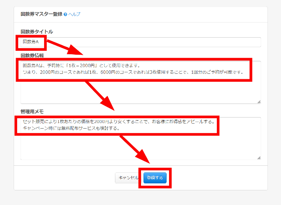回数券の名称と顧客に提示する情報、そして顧客には見せない管理者用のメモを入力し、「登録する」をクリック。