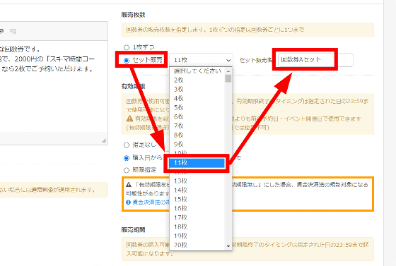 「販売方法を登録」のボタンをクリックして、回数券について何枚ずつセットで販売するのか、そして説明する文章を設定。