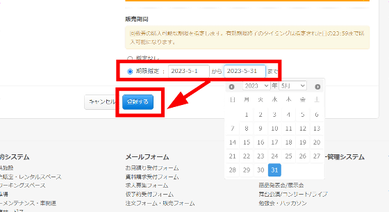 販売価格や販売期間、回数券の有効期限などを設定して、「登録する」をクリックすればOKです。ここでの注意点として、顧客から対価の前払いを受けて回数券を付与するシステムは資金決済法(資金決済に関する法律)において「前払式支払手段」に該当し、財務局への届出や供託といった規制が課せられる可能性があることが挙げられます。この規制を受けないようにするためには、回数券に有効期限を設けて期限を6カ月未満とするか、未使用残高が1000万円を超えないようにする必要があります。不安な場合は回数券の有効期限を180日に設定しておくのがオススメです。