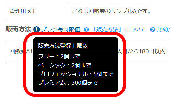 登録可能な回数券の種類はSelectTypeのプランごとに異なっており、フリープランとベーシックプランでは上限値が2個、プロフェッショナルプランでは5個、プレミアムプランでは300個となっています。