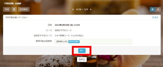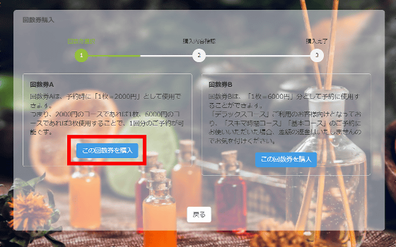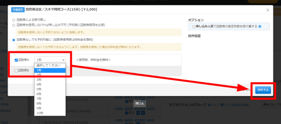 店舗やサービスのシステムに応じて、「回数券何枚でどのコースが予約できるのか」を設定すると、回数券を持つ顧客が予約する際に自動で必要枚数が選択されます。