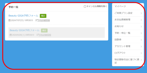 顧客はメンバーページにアクセスすると、自分が行った申し込みの予約情報の確認やキャンセル、支払い情報の管理、メンバー向けお知らせの確認、購入したサブスクリプションプランや回数券のチェックなどが可能。