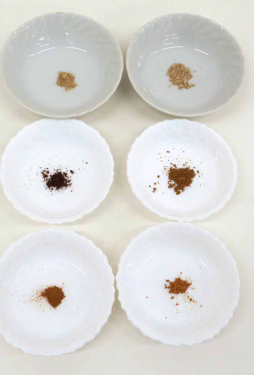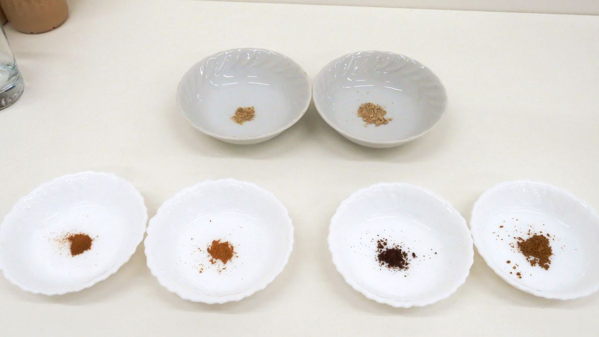 左が通常のスパイス(シナモン・カルダモン・クローブ)、右が凍結粉砕したスパイス(シナモン・クローブ・カルダモン)です。