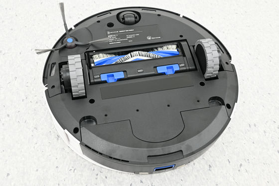 底面もオーソドックスなロボット掃除機といった印象。大きな駆動ホイールが左右に2つあり、前方には自由に動くユニバーサルホイールが1つ。中央にブラシがあり、駆動ホイールの外側に落下防止センサーがあります。