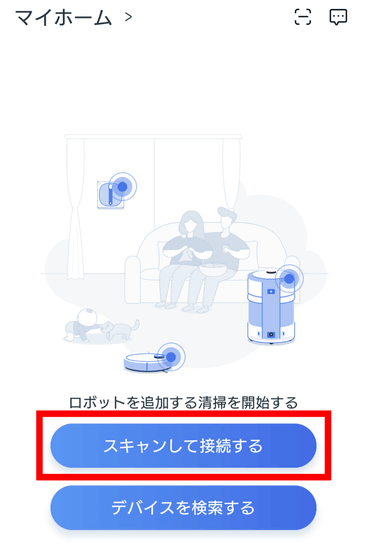 ECOVACS HOMEアプリのインストールを行います。過去にECOVACSの端末を使ったことがない場合、ホーム画面には端末が登録されていないので「スキャンして接続する」をタップ。