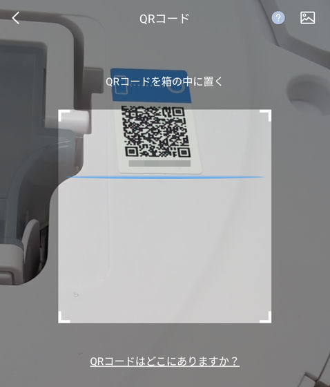 アプリがスキャン画面になるので、本体のトップカバーを外したところにあるQRコードを読み取ります。