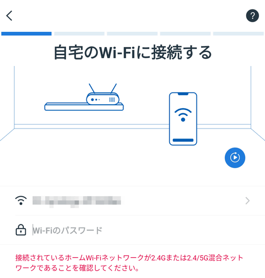 接続するWi-FiのSSIDとパスを入力して「次へ」をタップ。注意書きの通り、2.4GHz帯対応である必要があります。