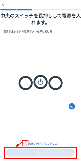 アプリに従って本体の電源を入れ、チェックボックスにチェックを入れて「次へ」をタップ。
