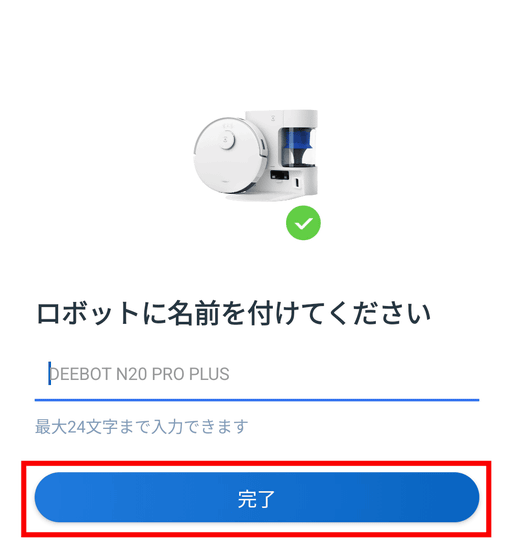 接続が完了したら、ロボットに名前をつけます。特にない場合、空欄にしておくと「DEEBOT N20 PRO PLUS」になります。名前を決めたら「完了」をタップ。