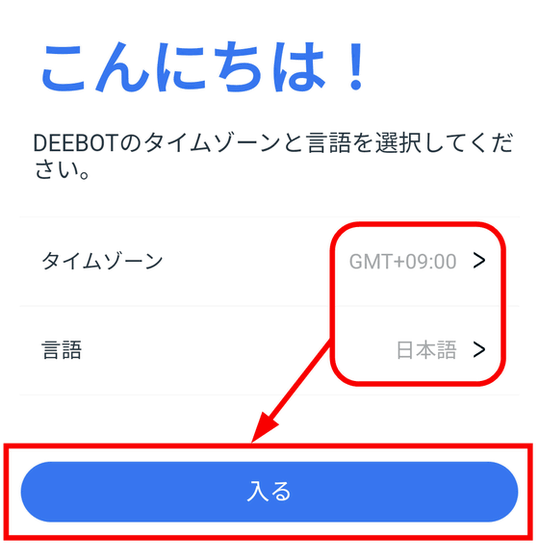 タイムゾーンと言語を設定して「入る」をタップ。