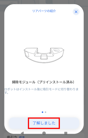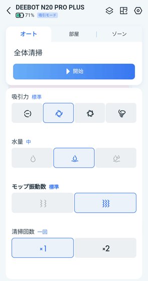 上にスワイプするとそれぞれ「吸引力」「水量」「モップ振動数」「清掃回数」の変更が可能。