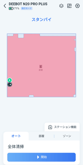 清掃してもらう場合は、ホーム画面で「DEEBOT N20 PRO PLUS」を選んだ状態で「清掃を開始する」をタップすればOK。