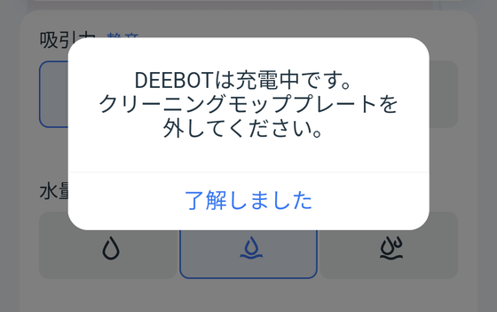 なお、モップ着用でステーションに戻ると、アプリで以下のように「クリーニングモッププレートを外してください」という警告ダイアログが表示されるので、吸引モジュールに付け替えて充電を行ってください。