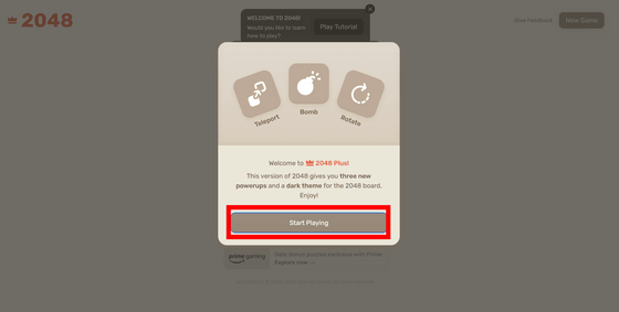 2048は、UNDOなど一部の機能が使えるスタンダード版、機能がなくシンプルなクラシック版、今回Prime Gaming向けにリリースされたプラス版の3つがあり、スタンダード版とクラシック版は誰でも無料でプレイできます。プラス版はスタンダード版で使える機能に加えて「TELEPORT」「ROTATE」「BOMB」の3つが新たに実装された特別バージョンです。