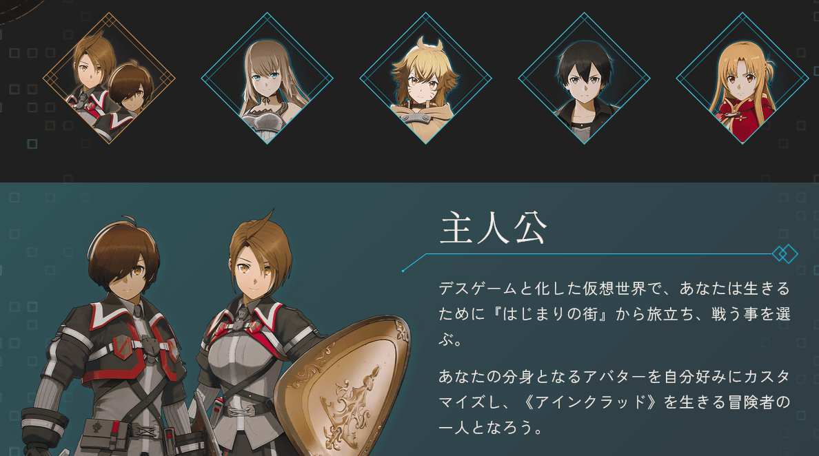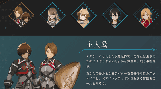 プレイヤーが操作する主人公は自在にカスタマイズするオリジナルキャラクターです。その他の登場キャラクターとして、ゲームオリジナルの「イオリ」のほか、原作にもたびたび登場する情報屋のアルゴ、原作の主人公・キリトやヒロイン・アスナが発表されています。
