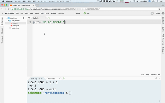 講座の後半ではAmazonが提供するクラウドであるAWSを用いてRuby on Railsでウェブサービスを作成していきます。まずRubyの書き方について学び、データベースとしてMySQLの使い方を習得し、そしてRuby on Railsと段階を踏んで学習していき、最後のセクションではソースコードのバージョン管理ツールであるGitについて学べます。