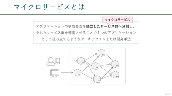 具体的な実装についての話は登場せず、講座の全編を通してスライドでの理論の解説が行われます。マイクロサービスそのものの解説に加えて、モノリスなシステムをマイクロサービスへ移行する場合のやり方の解説などもあり、受講すればすぐにでもマイクロサービス化する力を身につけることができます。