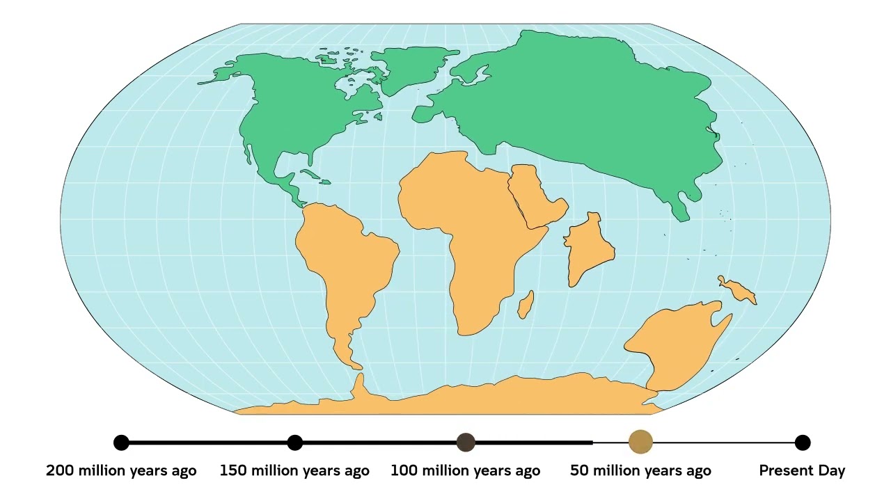 ゴンドワナ大陸はさまざまな大陸が分裂と衝突を繰り返す中で誕生しました。このアニメーションは、約2億年前にパンゲア大陸が分裂するところから始まっています。