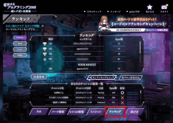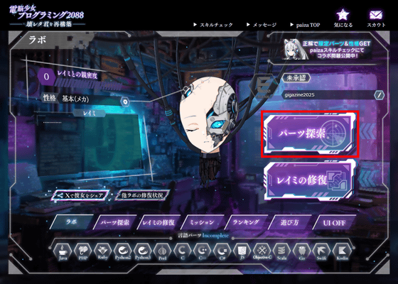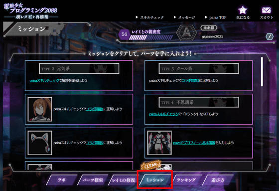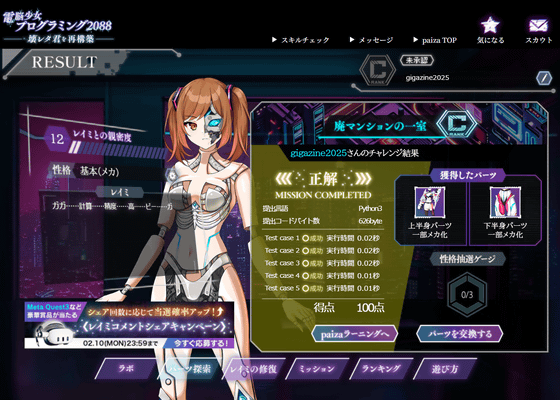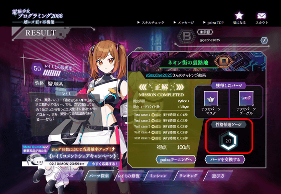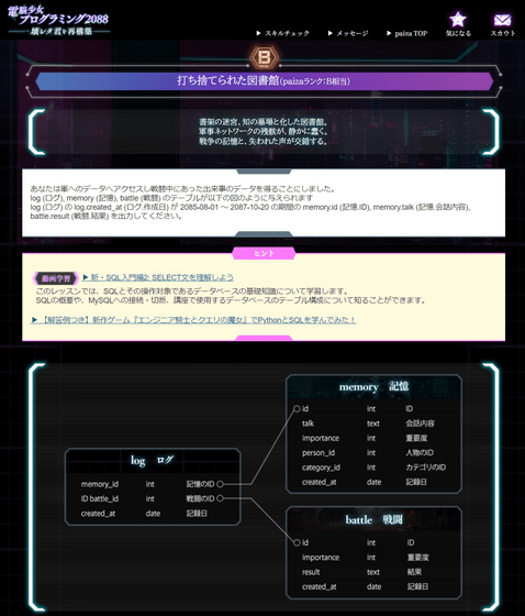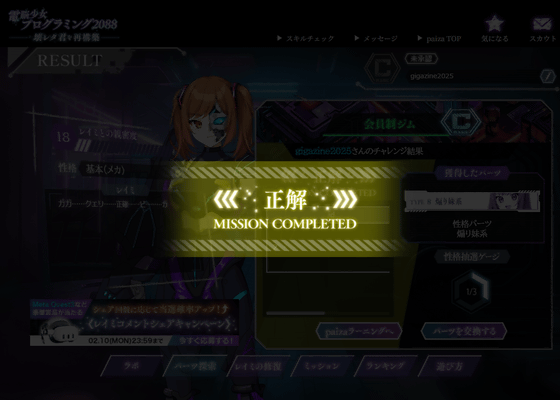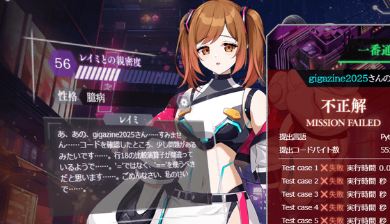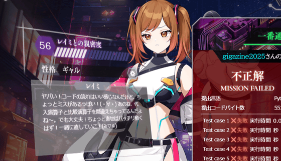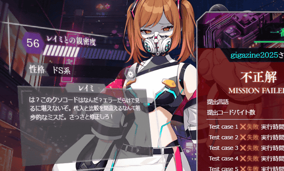 問題の難度はやや高めで、初心者や初級者だと正解できないレベルの問題も存在します。しかし、paizaにはpaizaラーニングなどの学習コンテンツも用意されているので、わからない部分は改めて学習することが可能。さらに、問題に挑戦する前にpaizaスキルチェックを利用すれば自分が今の自分の技術力がどれほどなのかを把握できるので、「電脳少女プログラミング2088 ─壊レタ君を再構築─」とpaizaのサービスを利用することで、体系的に自分のプログラミング技術を磨くことができるようになっていました。プレイは無料なので、興味のある人はぜひ自分でプレイしてみてください。