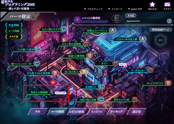 ネオンサインが光る街中の至る所を探索することが可能。青色の文字がSQL問題、緑色の文字がコード問題になっています。今回は難度が最も低い「街外れの戦場跡」を探索しました。