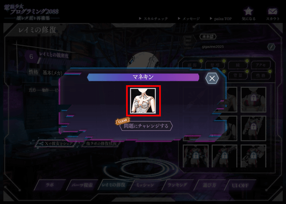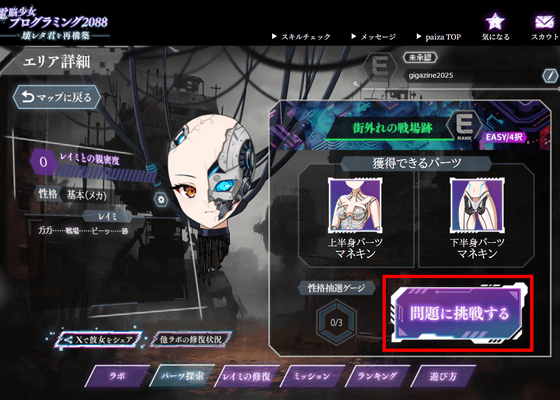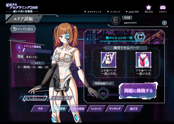 この会員制ジムの問題を解けば、「煽り系妹」の性格パーツをゲットできます。自分の知っているレイミが果たして煽り系妹だったのかはわかりませんが、少なくとも「ガガ……ピー……」としかしゃべらない状態よりは人間らしくなるはず。「問題に挑戦する」をクリック。