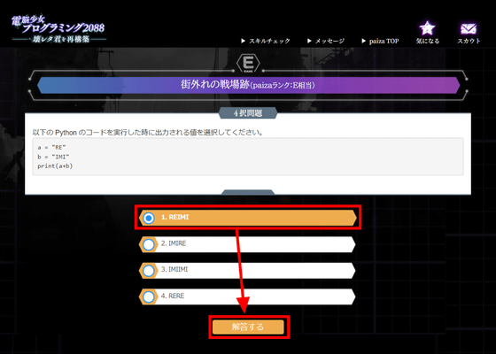 最も簡単なレベルEの問題はこんな感じで、Pythonのごく初歩的な4択問題となっていました。解答を選んで「解答する」をクリック。