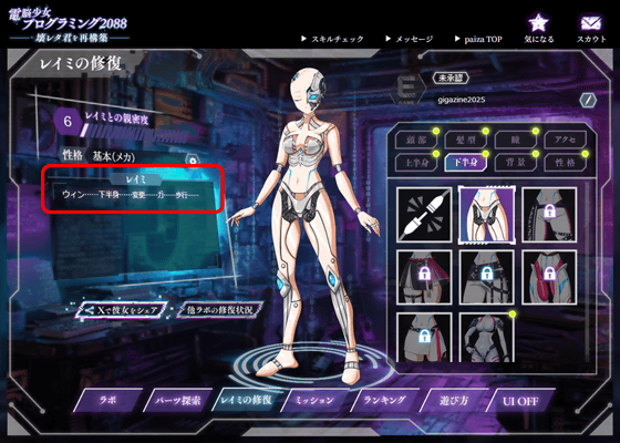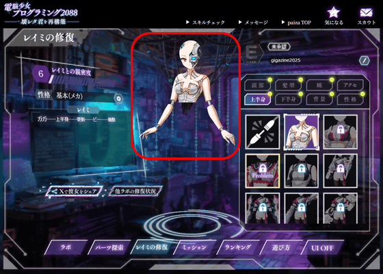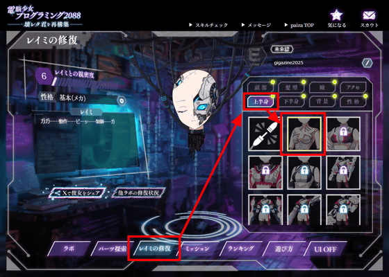 ゲットしたパーツをレイミに装備するには、「レイミの修復」からパーツの部位を選択します。錠前アイコンが書いていないものが所有しているパーツ。今回はゲットしたばかりの「マネキン」の上半身をクリックします。