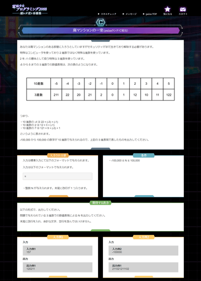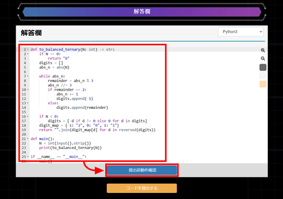 問題の難度が上がると、より実践的なプログラムのコーディングを求められます。以下は、10進数を特殊な3進数に変換するコードを書く問題。