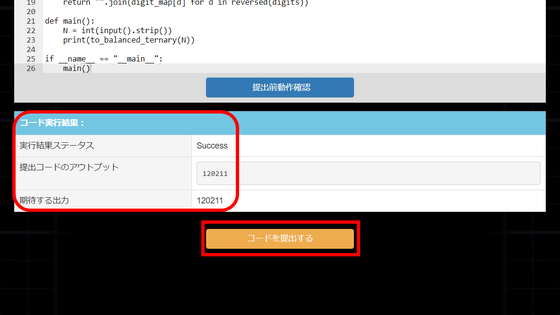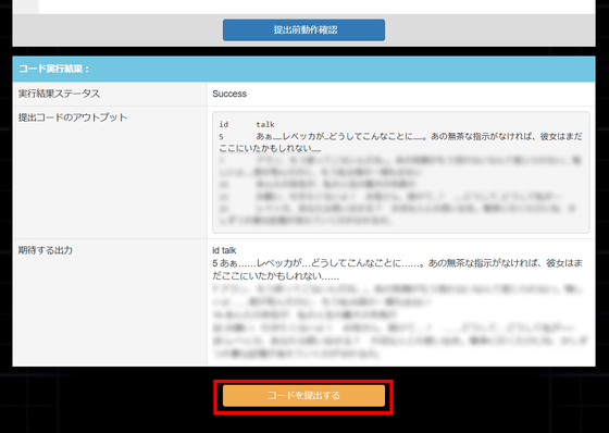 コードを提出する前に、期待する出力が得られるかどうかを確認できます。実行結果ステータスが「Success」になっていたので、「コードを提出する」をクリックします。