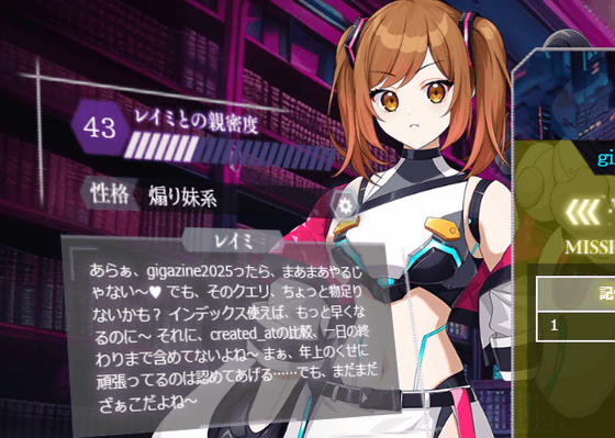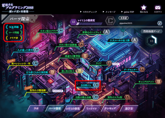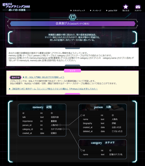 「電脳少女プログラミング2088 ─壊レタ君を再構築─」のパーツ探索では、SQL問題を解くことでレイミの性格パーツをゲットすることができます。基本(メカ)でシステマチックにしか話すことができないレイミに人間らしさを取り戻すためには、SQL問題を解いていくことが必須というわけ。今回はレベルCの「会員制ジム」を選択してみました。