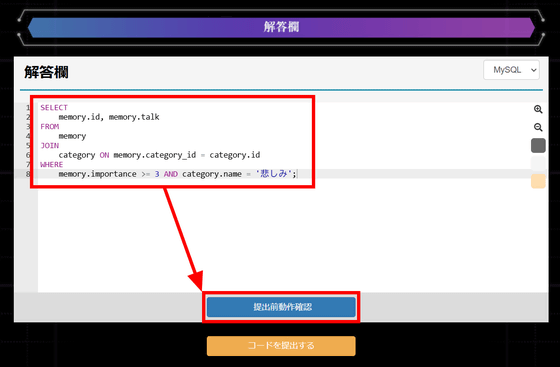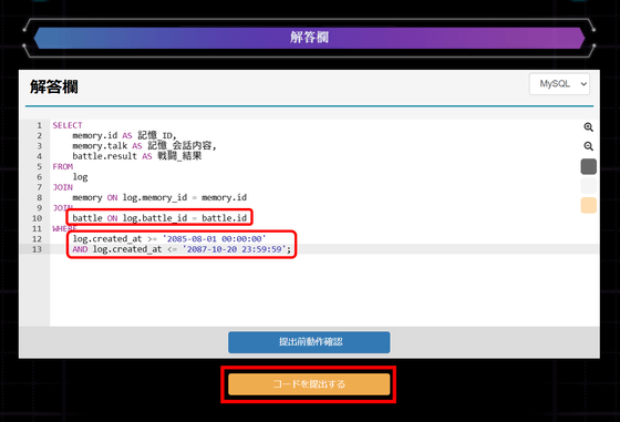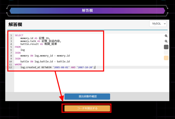 動作確認の結果、実行結果ステータスは「Success」だったので、問題なく実行できました。SQL問題に答えた際に出力される結果を見ると、「電脳少女プログラミング2088 ─壊レタ君を再構築─」のストーリーに関わるログが出力されています。つまり、SQL問題にどんどん答えていくことで、失われたレイミの記憶を探り、この世界のバックグラウンドを知ることができるというわけ。「コードを提出する」をクリック。