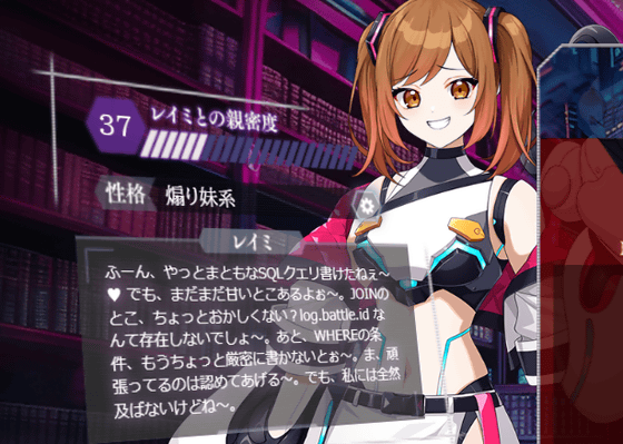 SQL問題をたくさん解いていくと、性格パーツが手に入るので、レイミの性格を自分の好みに切り替えることができます。性格は全部で17種類あり、性格に応じてコメントやセリフが変化するのはうれしいポイント。例えば、以下は「臆病」の性格パーツを設定したところ。ややオドオドとしながら、入力したコードの修正点を教えてくれました。