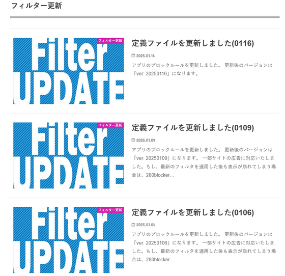 280blockerは有料の買い切りアプリですが、公式ブログをチェックするとわかる通り、常に最新の広告環境に合わせて広告ブロックを機能させるべく、高頻度で広告ブロックルールが更新されています。そのため、「買ったはいいもののサイトの広告ブロッカー対策によって使えなくなってしまった」というような心配はありません。広告ブロックルールが更新された場合、アプリ内からワンタップで更新を適用することが可能になっています。