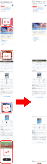 まず、以下はSafariでゲーム攻略系サイトの特定コンテンツにアクセスしてみた様子。左が広告ブロック前、右が280blockerで広告ブロックをした状態で、同じ量のコンテンツが表示されるまでを並べています。これだけでも、4つの広告を削除できていることがわかります。