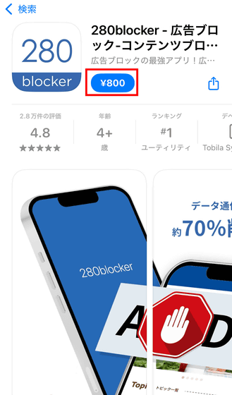 280blockerは有料の買い切りアプリで、価格は800円。iOS 13.0以降、iPadOS 13.0以降に対応しています。インストールするにはApp Storeから280blockerの配布ページにアクセスします。