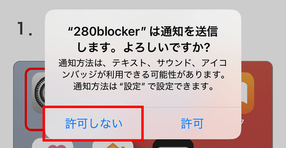 通知を許可すると広告ブロック中かどうかをアイコンバッジなどで見ることができますが、280blockerは通知を許可しなくても使うことができます。「許可しない」をタップ。