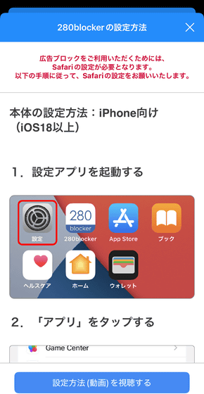 280blockerは主にSafariの拡張機能として広告をブロックするアプリのため、Safariの設定が必要です。アプリに設定方法が表示されるので、案内に従って設定を進めてみます。