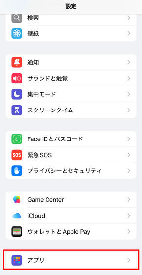 スクロールして「アプリ」をタップ。