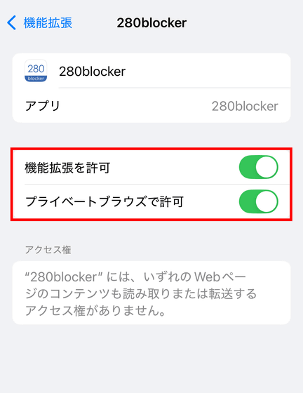 「機能拡張を許可」「プライベートブラウズで許可」のトグルスイッチをタップして、スイッチが緑色になったら設定完了。