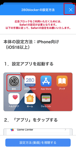 280blockerのアプリに戻って、右上の「✕」ボタンをタップして説明を閉じます。