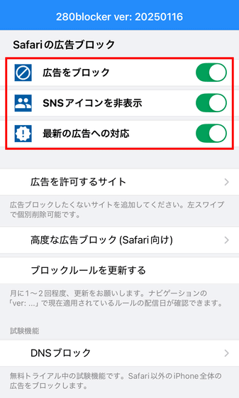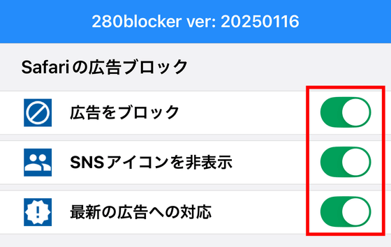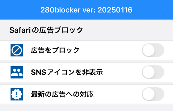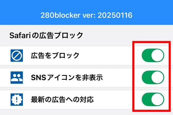それでは280blockerで「広告をブロック」「SNSアイコンを非表示」「最新の広告への対応」のトグルスイッチをタップして、広告ブロックをオンにします。