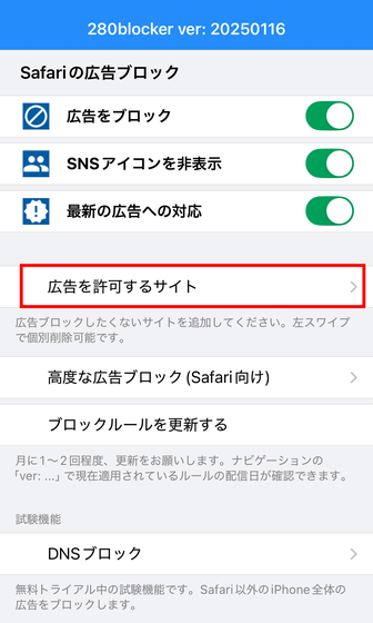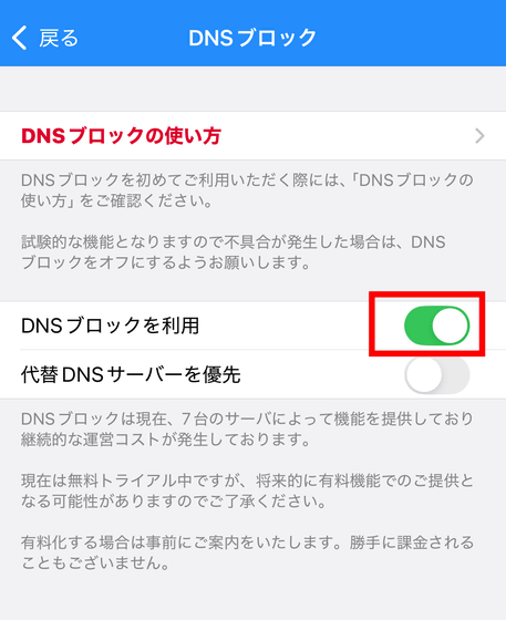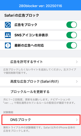「DNSブロック」はトライアル中の機能で、Safari以外のiOSアプリでも広告をブロックできるというもの。ひとつ注意点として、DNSブロックは試験的な機能のためうまく働かないアプリもあるほか、将来的に有料機能での提供に変わる可能性もあるとのこと。ただし、「DNSブロックを使っていると急に課金された」ということはなく、有料化する場合は事前にアナウンスされます。